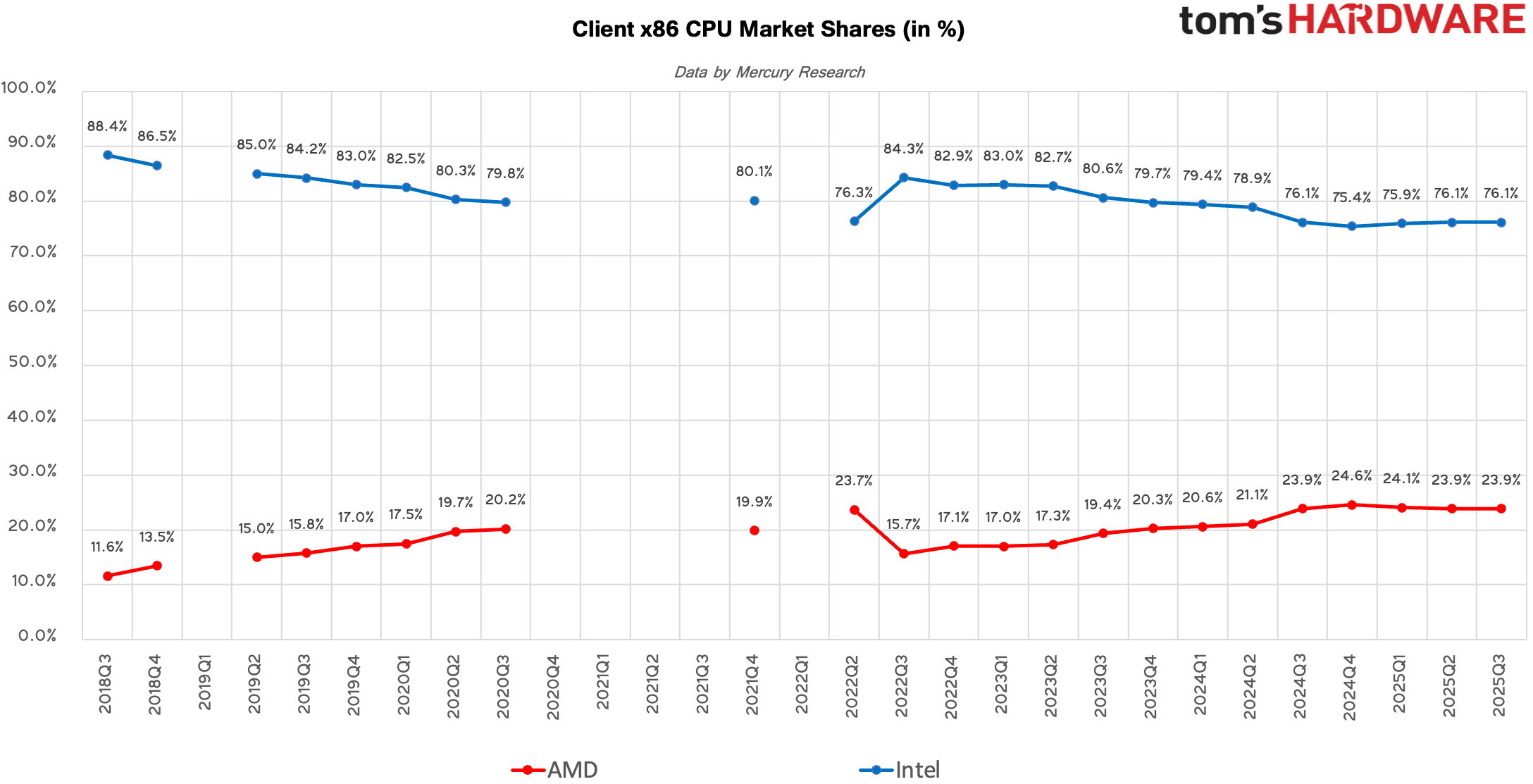 AMD increased its share across all markets served by x86 processors at Intel's expense in the third quarter of 2025, according to Mercury Research. Intel is holding strong, and as its latest offerings for client and server systems got significantly more competitive than they were several quarters ago, the pace of AMD's gains has slowed down considerably. However, during the quarter, AMD achieved two important milestones: it now commands shipments of over 25% of all x86 CPUs, and it now ships over 33% (one-third) of desktop x86 CPUs.