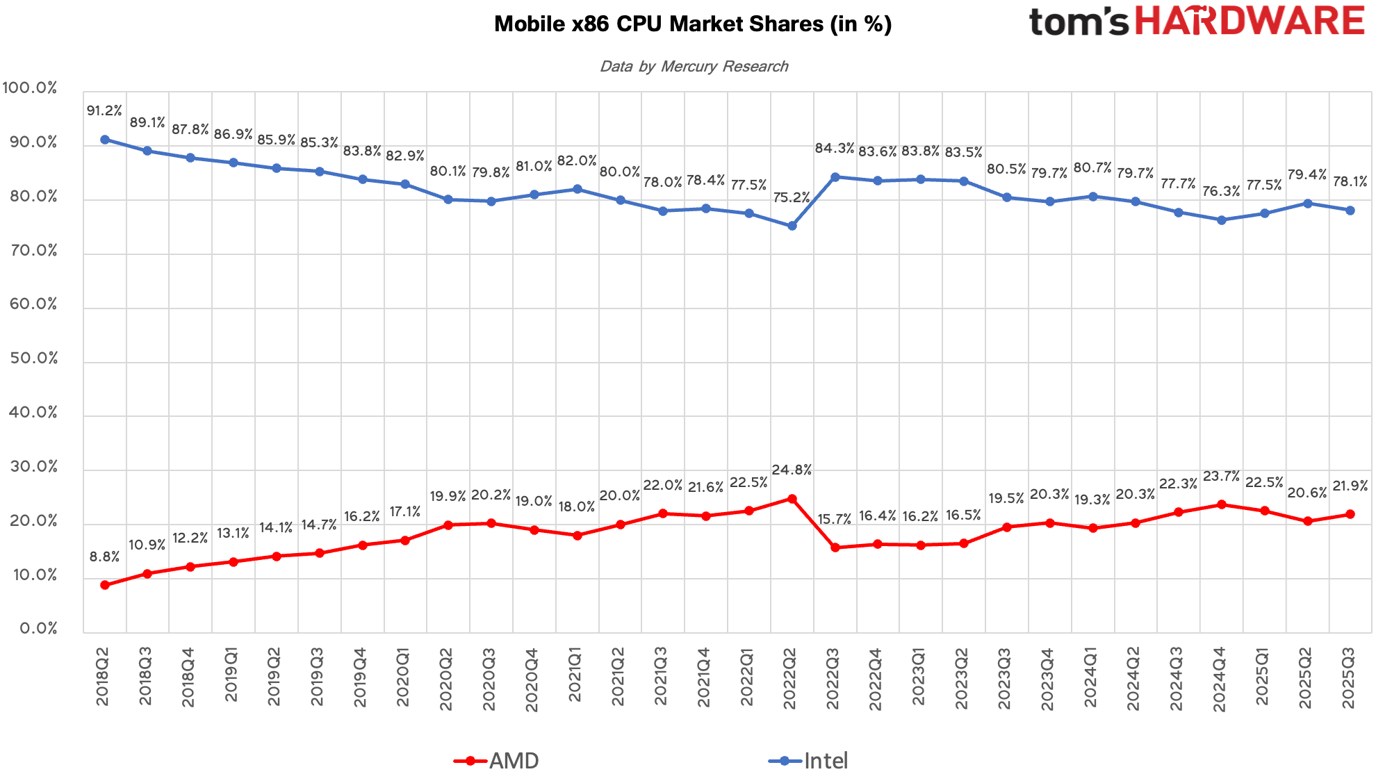 AMD lost market share to Intel in the mobile CPU space in Q1 and Q2 2025, but the company outperformed Intel in Q3 2025 on a sequential basis, gaining unit share as Intel struggled with reduced shipments of its entry-level small-core processors.