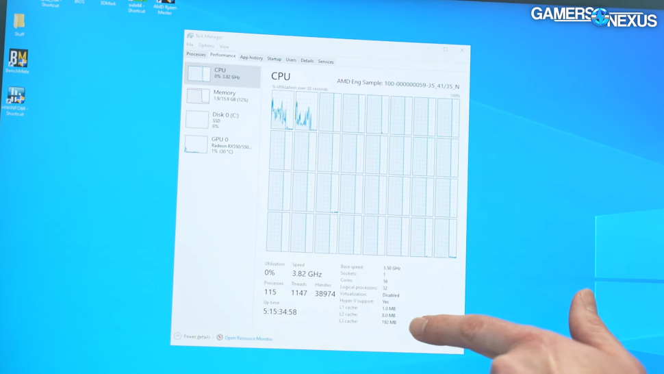AMD showed off two functional high-core counts Zen 3 X3D prototypes to Gamers Nexus, including a 16-core and 12-core model featuring 3D-VCache on both CCDs. The chips were fully functional within Windows actively and were shown actively running an AIDA64 stress test on screen. Bill Alverson showed a glimpse of the chip’s specs in Task Manger, revealing the massive 192MB of L3 cache equipped on both CPUs, thanks to the “dual 3D-VCache” implementation.
