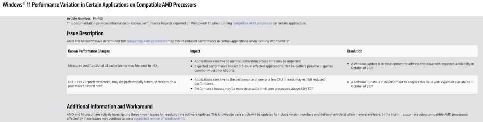 AMD has announced that all of its Windows 11-compatible processors can suffer from reduced performance in some applications when used with the new operating system, with extreme outliers in eSports gaming titles resulting in up to a 10-15% reduction. For applications, AMD says that the performance impact weighs in at 3–5%. A software update and a Windows Update are in the works to address the issues, with both expected to arrive in October 2021 (this month).