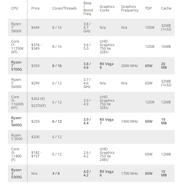The 65W eight-core 16-thread Ryzen 7 5700G comes with a 3.8 GHz base, 4.6 GHz boost, and eight Radeon Vega CUs that operate at 2.0 GHz.
