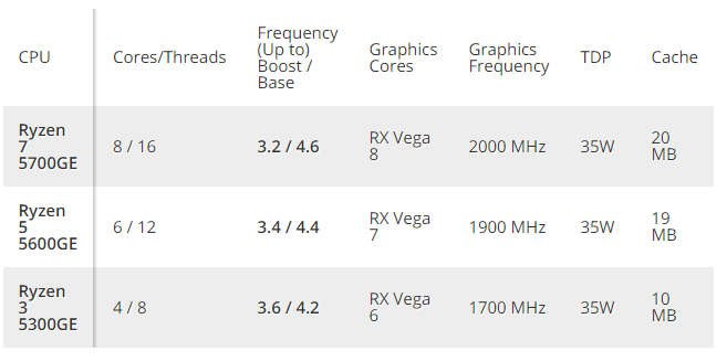 Based on suggested pricing, the 5600G contends with the Core i5-11600K and doesn't do much to address the current value budget champ, the Intel Core i5-11400. That's largely because AMD has decided not to include the 65W Ryzen 3 5300G, which it ships into the OEM market, in this round of chip releases. It also has yet to release the GE-series chips listed in the table below. AMD hasn't indicated when the Ryzen 3 or GE-Series Cezanne chips will come to market.