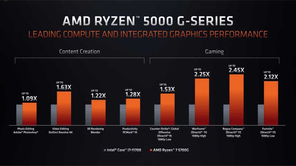 AMD shared a surprisingly slim selection of its own benchmarks to compare the Ryzen 7 5700G with Intel's Core i7-11700. AMD's test notes are also lacking. As with all vendor-provided benchmarks, you should view these with the requisite amount of skepticism.