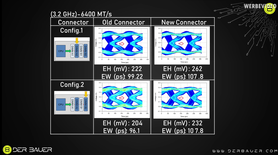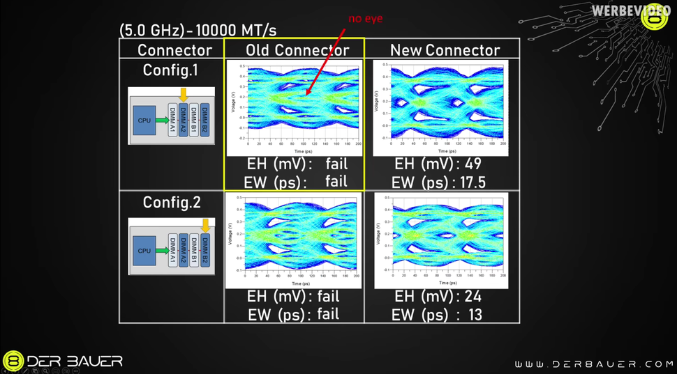 In the first image, there is not much difference in signal quality between NitroPath and standard RAM slots, meaning NitroPath also will not make much difference for RAM at average speeds. But image 2 tells a different story. Here, clocked at 10,000 MT/s, standard RAM slots have a problem. The RAM in the standard slots has no eye, and its signal is muddled severely. This muddled signal results in an unstable system, which may not boot. The NitroPath slots have no such problem. The eye, while small, is still visible, and RAM in NitroPath slots can run stable at 10,000 MT/s.