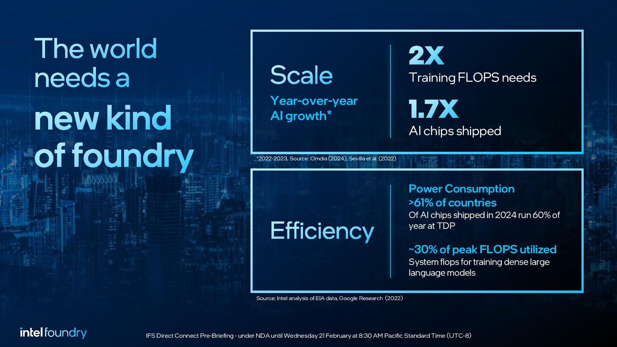 As part of the coming out party, Intel has also renamed IFS to Intel Foundry. Intel Foundry has a goal of being the second-largest foundry in the world by 2030, and IFS Direct Connect 2024 is the company’s coming out party as a ‘systems foundry,’ an Intel-defined term that quantifies its experience with system-level design and includes all its technology development, manufacturing, supply chain, and the Intel Foundry Services under one umbrella. This includes not only producing processors of varying types, but also providing customers with packaging and connectivity fabric solutions - and even helping with cooling solutions. Intel Foundry caters to both external customers and internal customers from within Intel, with the goal of serving both equally (an important distinction) with a resilient and sustainable supply chain.