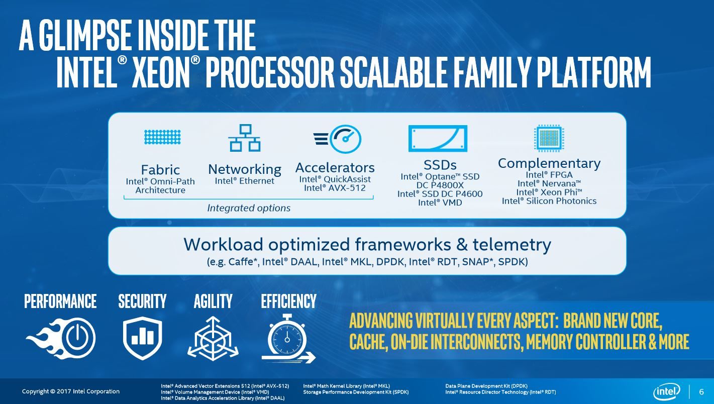 Intel's E7 family (four- to eight-socket) now falls into the Gold category, while the E5 family (two- to four-socket) slots into the Silver category. Intel will add as-yet undefined products into the upper and lower tiers in the future. Intel didn't release specifications for the new Skylake-SP models but listed integrated QuickAssist (QAT) AVX-512 accelerators, new on-die interconnects, and memory controller as key features. Intel also lists FPGAs, Nervana (ASICs), Xeon Phi, and silicon photonics as complimentary platform features.