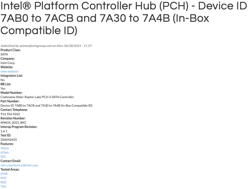 Last month an Intel contractor submitted compatibility testing results for the company's upcoming "Alder-Raptor Lake PCH-S SATA Controller" to SATA-IO (via @Komachi_Ensaka), an organization that oversees and supports the SATA specification. The document covers Intel's Platform Controller Hubs (PCHs) featuring 7AB0, 7ACB, 7A30, and 7A4B device IDs, which are probably the company's 600-series chipsets for desktops and laptops.