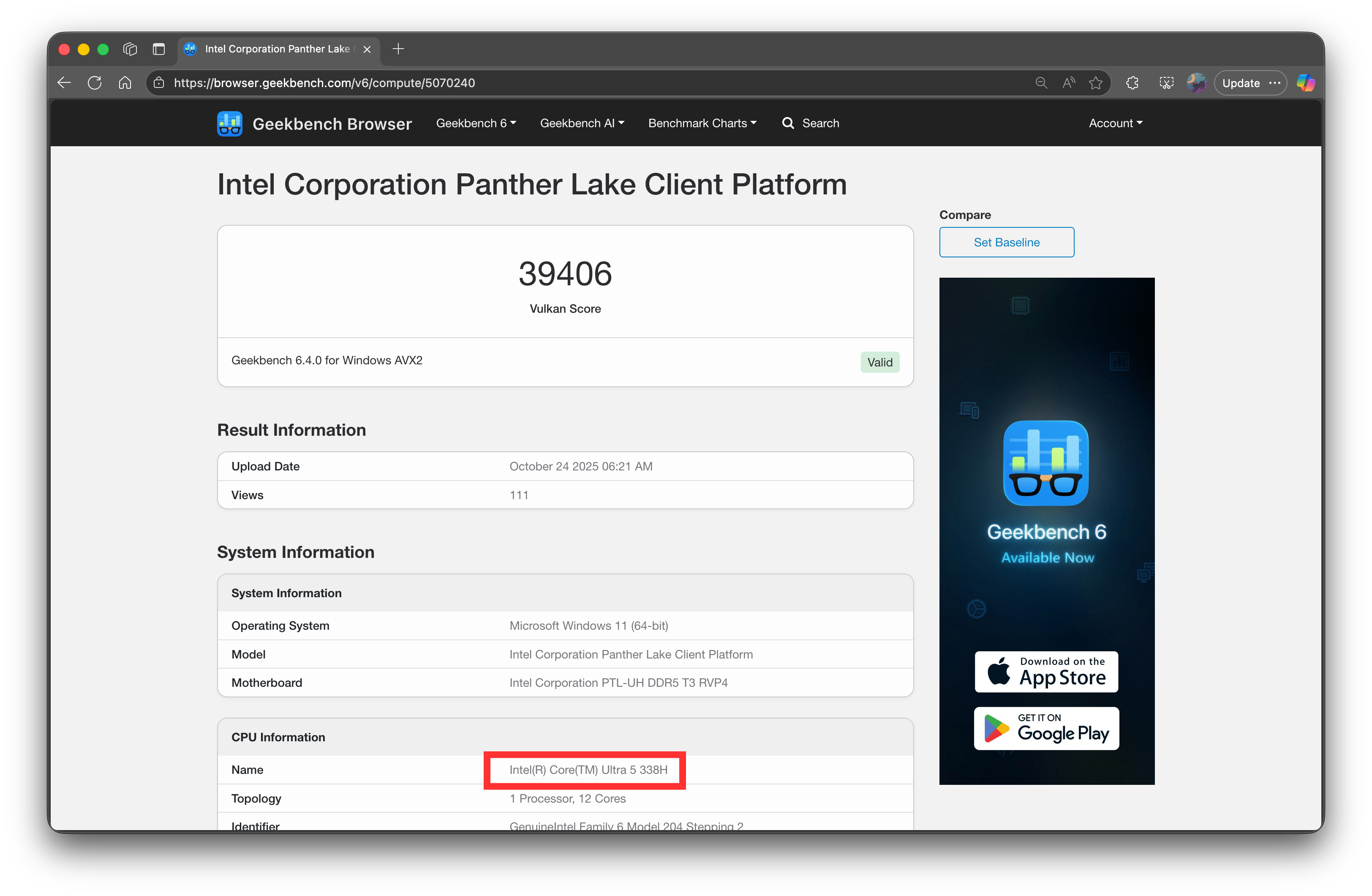 The 39,406 score in the actual Geekbench listing is not that impressive when you consider the architectural leap, the node improvements, and the fact that two extra cores only yield a roughly 4% higher score than last-gen's competing Lunar Lake GPU — the Arc A140T, which scores 37,953 points on average. Still, the performance is in line with AMD's Radeon 880M iGPU, which is found in the company's Strix Point APU lineup and is listed at around 39,917 in Geekbench. Overall, Panther Lake's integrated graphics seem to be solid.