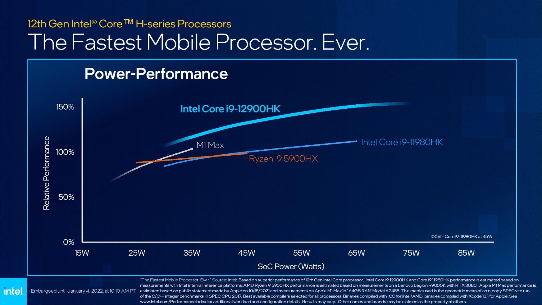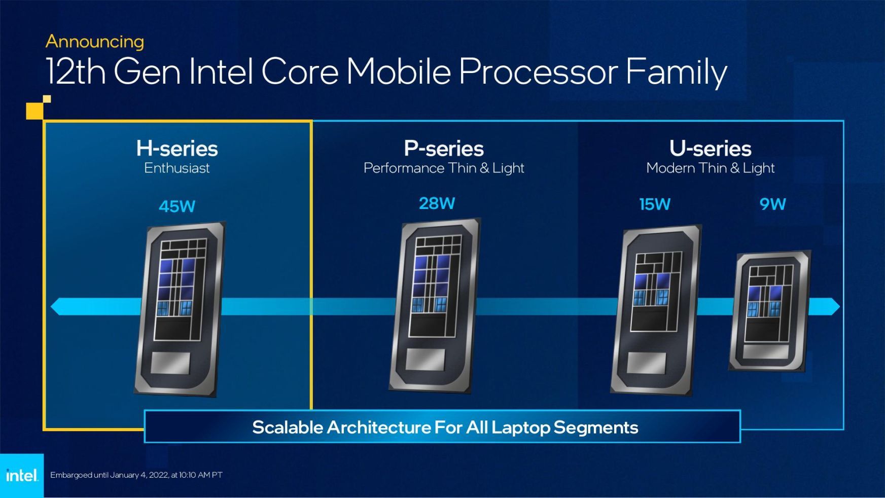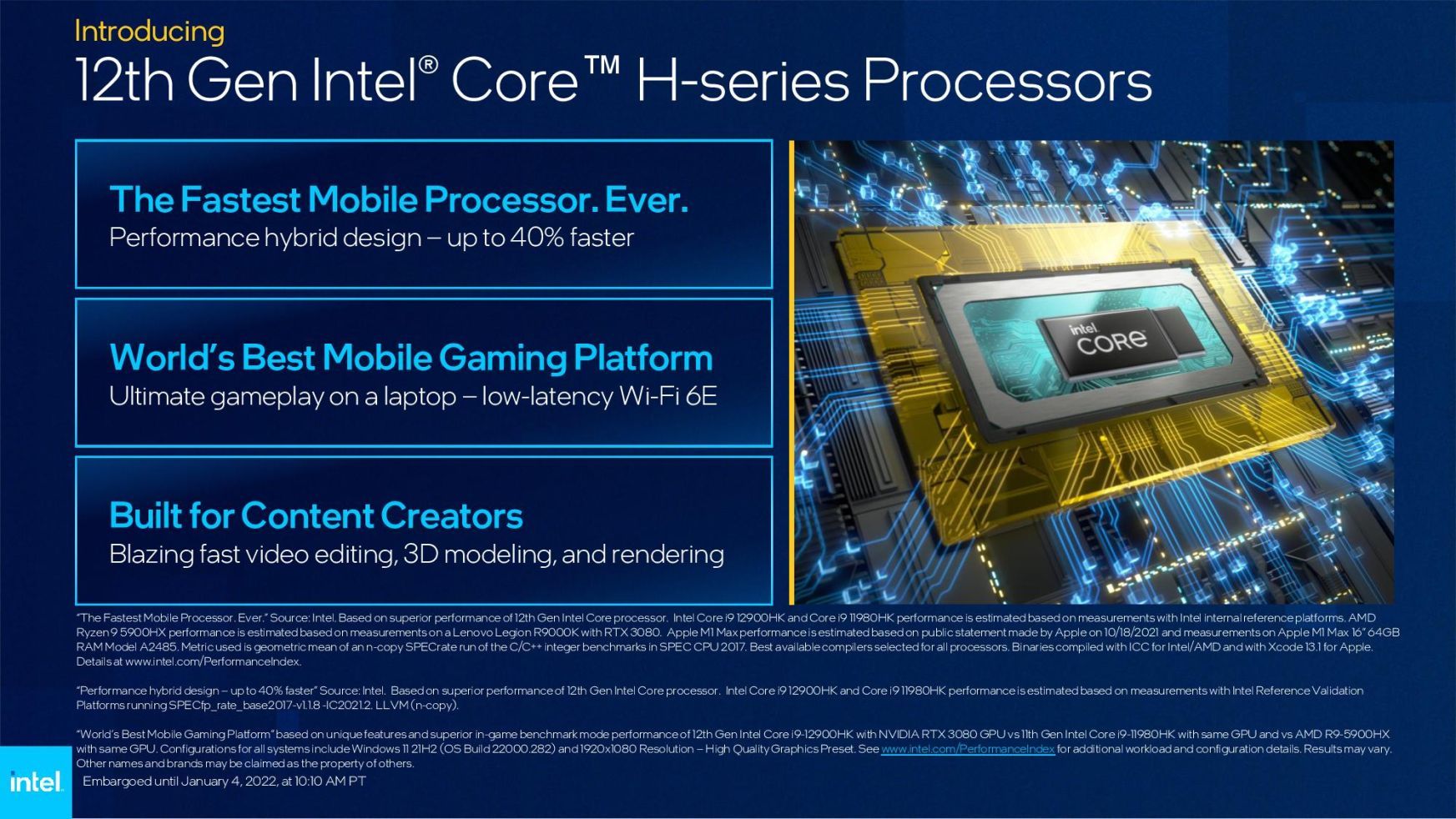 Intel finally unveiled its full Alder Lake Mobile lineup today, including the new 45W H-series that tops out at 14 cores and a 5.0 GHz boost, the 28W P-series, and the 18W U-series models. Intel claims that its 14-core 20-thread Core i9-12900HK is now the world’s fastest mobile processor, even compared to Apple’s M1 Max and M1 Pro. Intel also claims the H-series is the world’s best mobile gaming platform with up to a 28% gain in gaming and 40% gain in creativity apps over the previous-gen models.