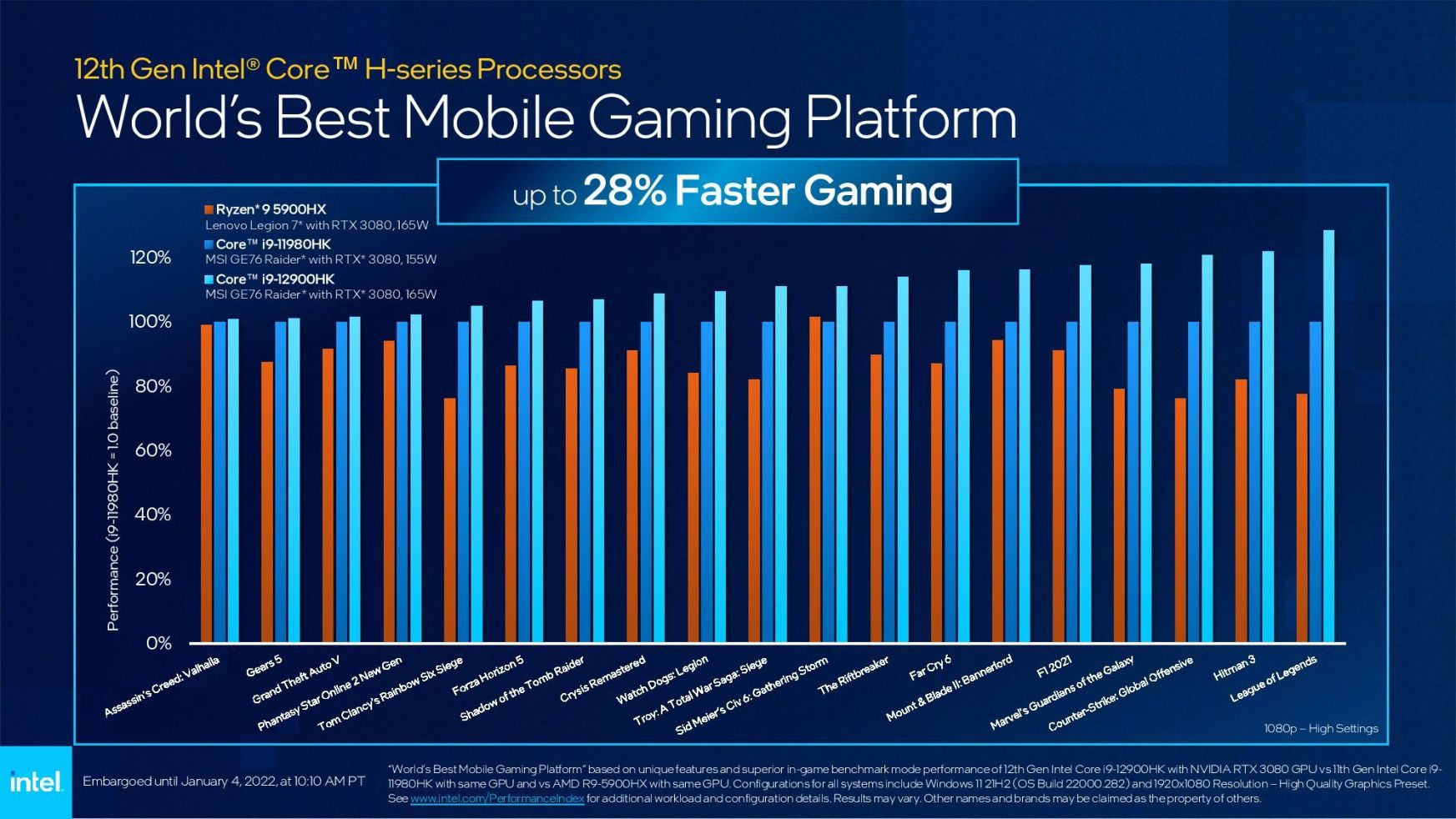 Intel also provided gaming benchmarks with the Core i912900HK squaring off with the Ryzen 9 5900HX across a broad range of game titles, claiming an “up to” 28% advantage in gaming with both chips tested at a 165W TDP and an RTX 3080 GPU.