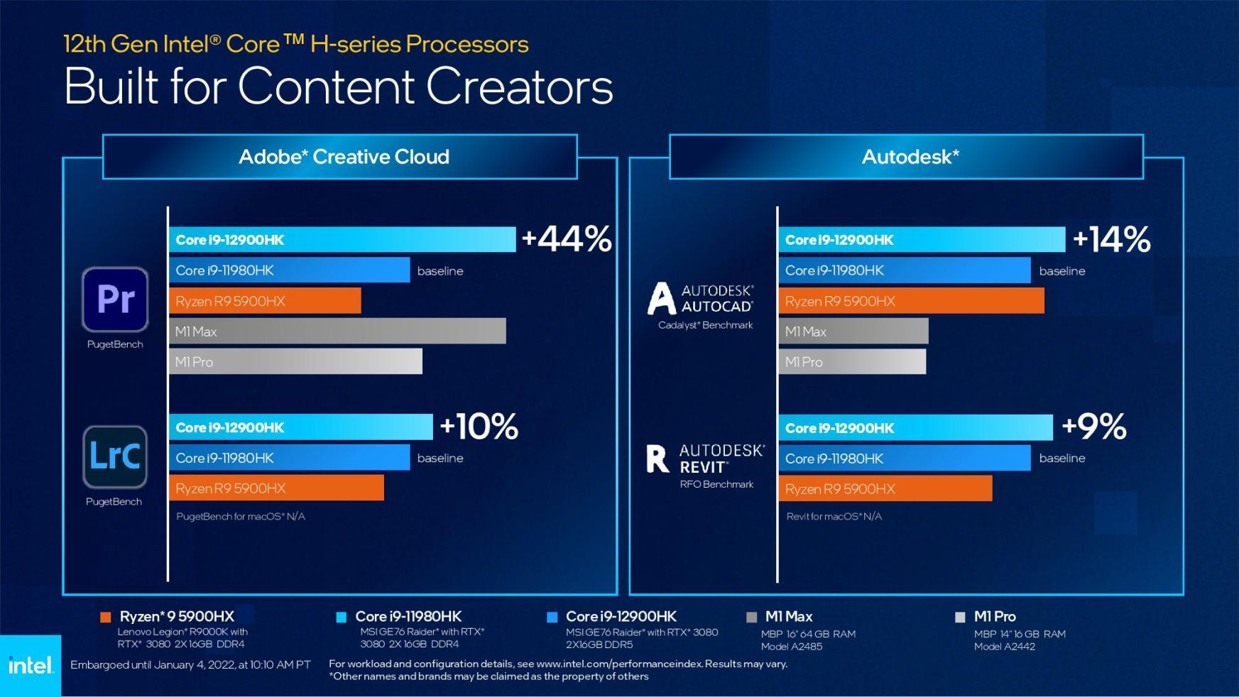 Turning to productivity applications, Intel showed its Core i9-12900K taking on the Ryzen 9 5900HX and the M1 Max and M1 Pro in a spate of workloads. In Blender, the Intel chip took 30% less time to finish the job than the 11980HK but beat the 5900HX and M1 chips by smaller margins. It also tied the M1 Max and beat the M1 Pro slightly in the CrossMark creativity benchmark while beating the 5900HX thoroughly. Intel also shared testing with Adobe Creative Cloud and Autodesk, both of which had issues running with the M1 Max and Pro in some tests.