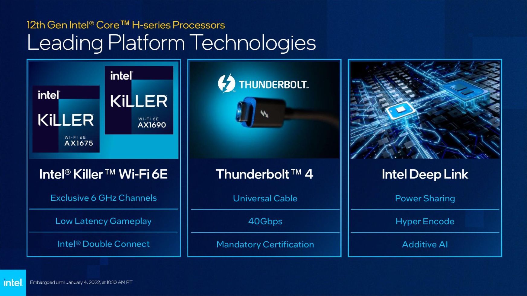 As we covered earlier, Intel’s Alder Lake platform supports four different types of memory. The chip rides on a 50x25mm BGA package and supports 16 lanes of PCIe 4.0, with eight lanes dedicated to a discreet GPU and two x4 connections for M.2 SSDs. It also supports four Thunderbolt 4 connections that operate at 40 Gbps apiece. As before, Intel has integrated the digital portion of its Wi-Fi 6E (Gig+) connection directly into the chip, while the RF companion module connects externally.