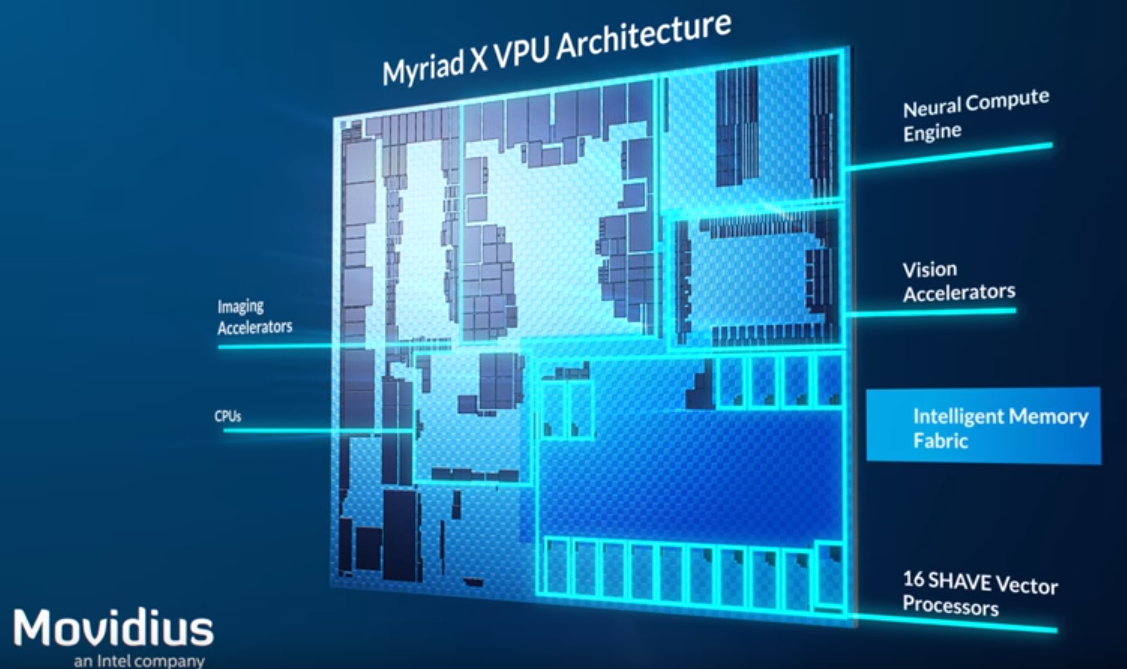 The diminutive 16nm VPU (Vision Processing Unit) SoC includes vision accelerators, a Neural Compute Engine, imaging accelerators, and 16 SHAVE vector processors paired with a CPU in one heterogeneous package. The combination of units provides a total of up to 4 TOPS (Trillion Operations Per Second) of performance within a slim 1.5W power envelope.