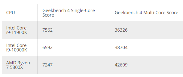 But against the 5800X, the single-core results are much closer, naturally, with Zen 3's much higher IPC performance. Here the 11900K pulls ahead of the 5800X by a mere 4.4%. Strangely though, the 5800X pulls ahead of the 11900K in the multi-core department by 17%, which is a larger delta than we expected because these are both eight-core chips.