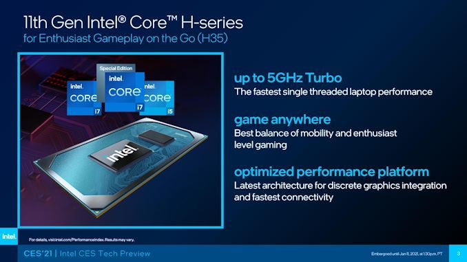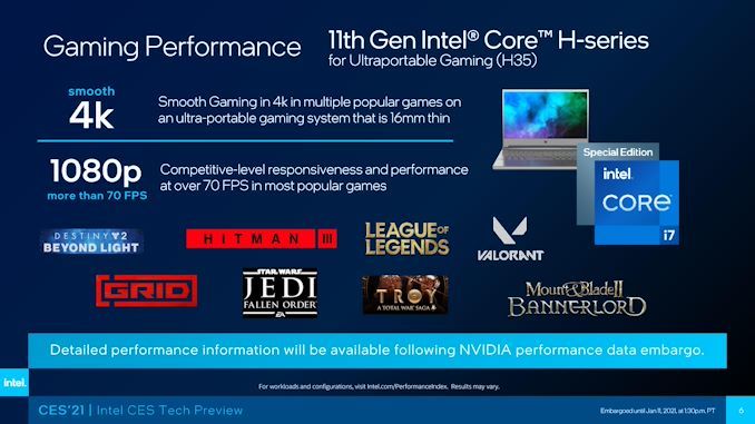 Intel states the goal with H35 is to enable ultraportable gaming – bundled with a discrete GPU, Intel says that H35 will enable 16mm enthusiast laptops with 14-to-15-inch screens offering smooth 4K gaming or 1080p at 70+ FPS. Intel states that they expect to have 40+ designs in the market though the first half of the year, with key OEMs on board, such as Acer, ASUS, MSI, Vaio, Dell, HP, and Lenovo.