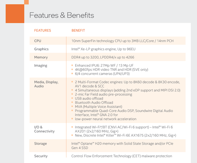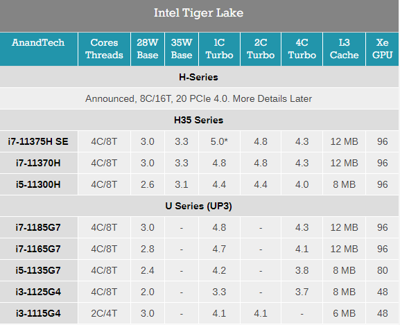 Because this is the U-series moving up to 35 W, I’m surprised Intel called it H35, rather than U35, which would be more accurate. What Intel has done is taken its existing 11th Gen Core Tiger Lake processor, with four Willow Cove cores and Iris Xe graphics, and pushed it beyond the usual 15 W or upper 25 W power level, into the 35 W market. One of the key marketing strategies of Intel is that its processor cores are highly scalable, from mobile to server, so pushing this shouldn’t seem too much of a stretch – we already know that the 15 W model will consume 50 W or more for a brief turbo period. The question on raising the sustained power level is usually one of longevity, as well as binning and pricing.