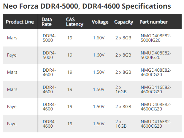 The DDR4-4600 memory kits, on the other hand, are available in both 16GB (2x8GB) and 32GB (2x16GB) capacities. Unlike the DDR4-5000 memory kits, these only need 1.50V to operate. Neo Forza will eventually launch a 64GB (2x32GB) DDR4-4600 in the Faye flavor.