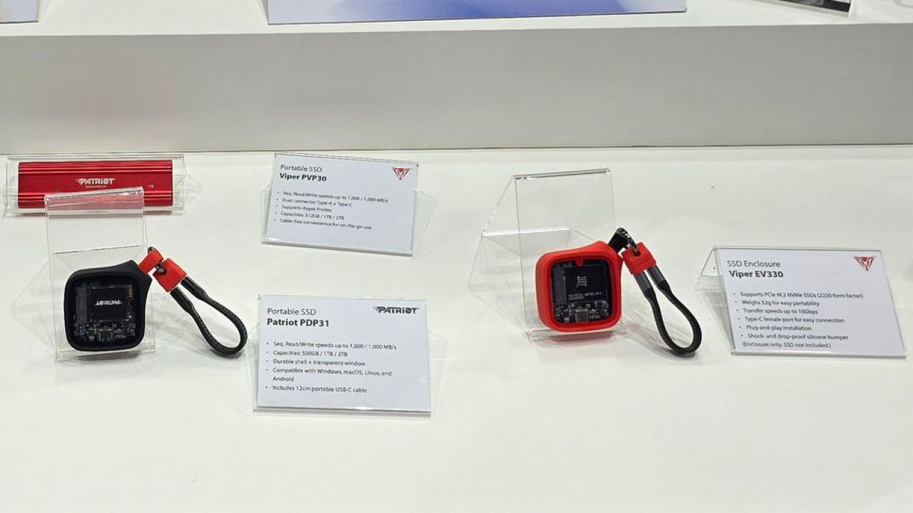 Patriot also showed off a wide variety of external storage solutions, such as the Patriot PDP31 and Viper EV330, sporting highly durable clamshells. The PDP31 comes in 500GB, 1TB, and 2TB capacities with read and write speeds of up to 1GB/s with USB 3.2 Gen 2 support. The EV330 is apparently a more DIY-focused unit, sporting compatibility with PCIe M.2 2230 form factor SSDs (like the Crucial P310).