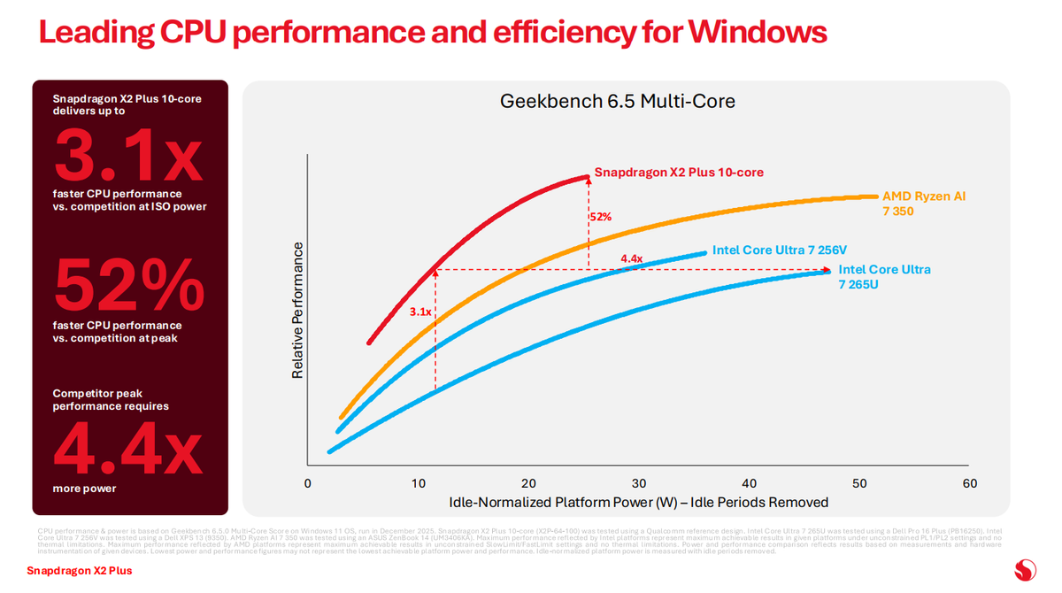 Efficiency is one of Qualcomm’s strongest selling points, which it looks to maintain with the X2 Plus lineup. Testing in Geekbench 6.5, Qualcomm claims the X2-64-100 offers a 3.5x single-core and 3.1x multi-core boost compared to the Intel Core Ultra 7 265U at ISO power (5W and 10W, respectively, in this case). At peak power, Qualcomm claims a 28% and 52% jump in single-core and multi-core performance, respectively, compared to the Core Ultra 7 265U.