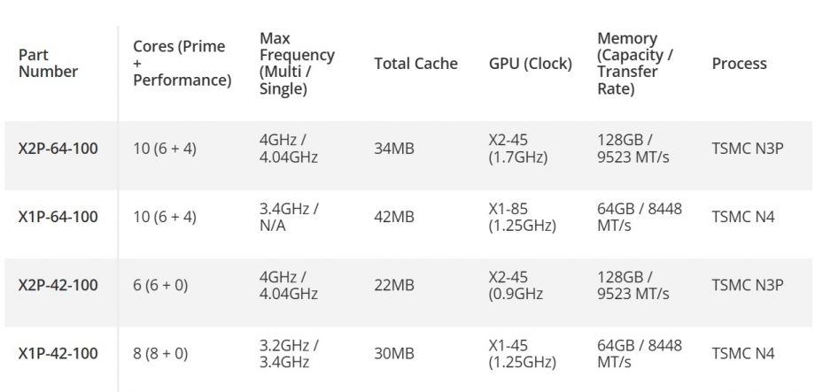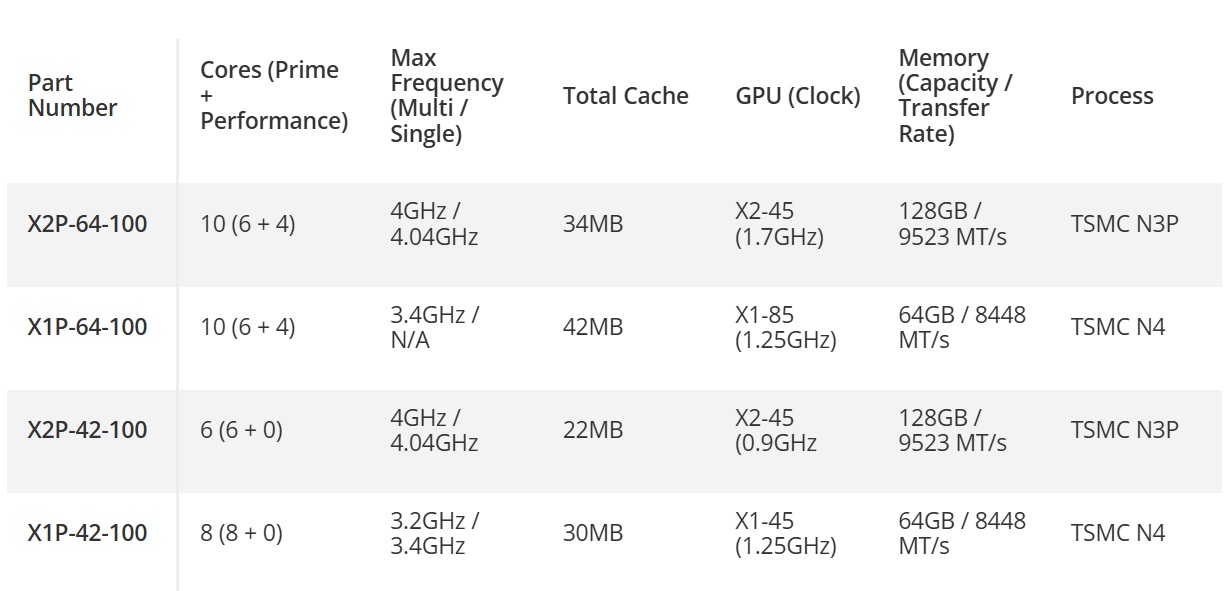 The top-end X2P-64-100 variant has 10 total Oryon cores, split across six Prime cores and four Performance cores. The X2P-42-100 comes with the same six Prime cores but no Performance cores.