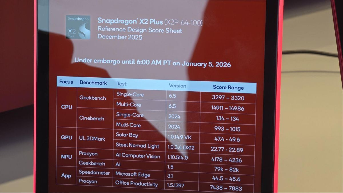 For hard numbers, Qualcomm provided a range of test scores for the X2P-64-100 in a spate of popular benchmarks, which you can see above. During a pre-CES event, we were able to see this chip in action in a Qualcomm reference design running Geekbench 6.5, and the results were slightly higher than the ranges Qualcomm shared.