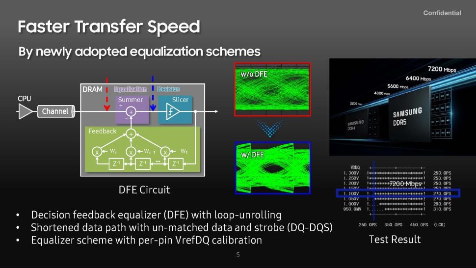 According to Samsung's presentation, the manufacturer has implemented Same-Bank refresh (SBR) with its DDR5-7200 memory module. Samsung's touting an efficiency uplift of the DRAM bus by up to 10%. The company also touched on the new decision feedback equalizer (DFE) that helps improve signal stability.