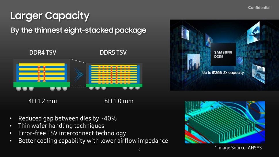 The company built its DDR5-7200 memory module with eight-stacked DDR5 dies that are interconnected with TSV (through-silicon-via) technology. This is a huge improvement over DDR4, which was previously limited to four DDR4 dies. Despite a more dense design, the DDR5 stack measures 1.0mm in comparison to DDR4's 1.2mm. Utilizing thin wafer handling techniques, Samsung was able to reduce the gaps between the dies by 40%, allowing a height reduction on the stacks.