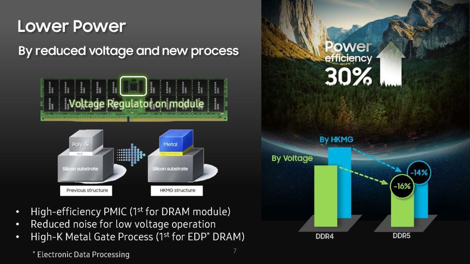 The DDR5-7200 memory module operates at 1.1V, just 0.92x the voltage for DDR4. The improved power efficiency was possible thanks to the high-efficiency power management IC (PMIC), voltage regulator and the High-K Metal gate process. Samsung stated that its PMIC not only contributes to lower voltage operation, but it also reduced the noise in the process. As expected with DDR5, Samsung's memory module comes with on-die error-correction code (ODECC) to ensure more reliable and secure data handling.